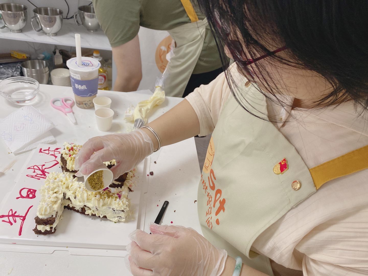 在烘焙现场,烘焙师傅介绍制作过程所需食材、设备和工具,并通过APP演示详细的制作步骤。了解完制作方法,心灵手巧的党员老师们迫不及待地系上围裙开始创作。和面,打发,烤蛋糕胚、制作奶油,每一个步骤都需要极大的细心才能使蛋糕呈现出最好的口感。在装饰蛋糕的环节,党员老师们尽情发挥创意,裱上各种图案花纹和装饰品以突出“七一”的喜庆气氛。经过约两个小时左右的制作,一个个别具心裁、造型靓丽的蛋糕出现在眼前,党员教师们在一片欢声笑语中争相拍照留念。