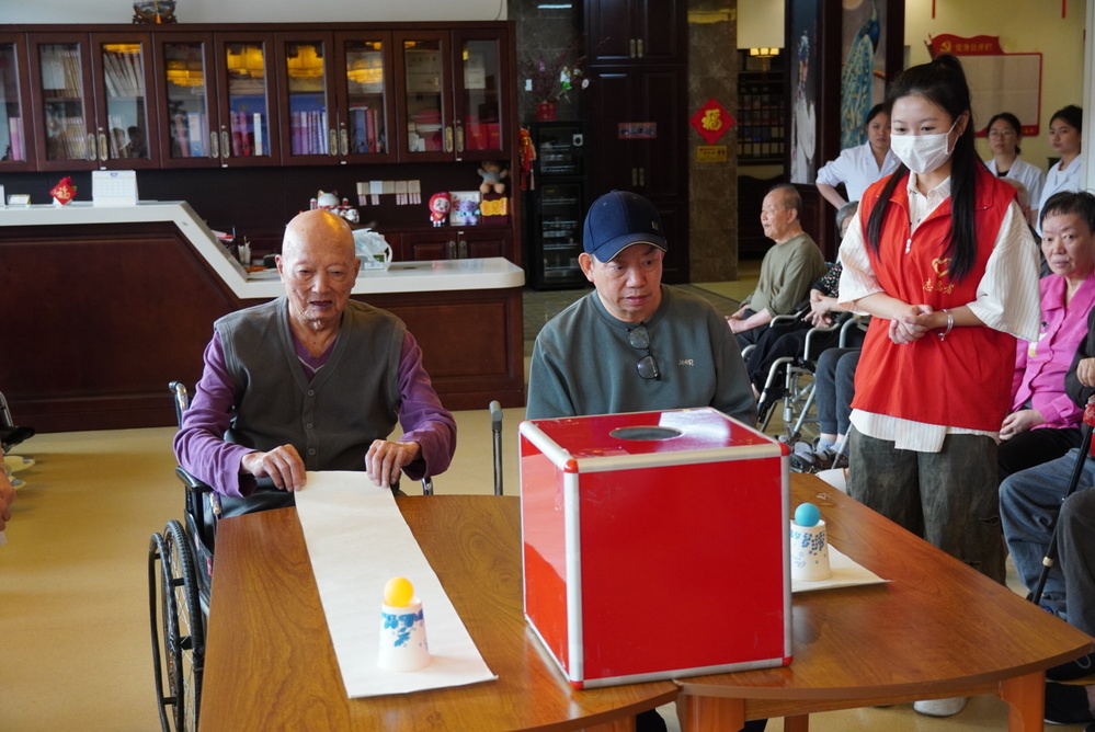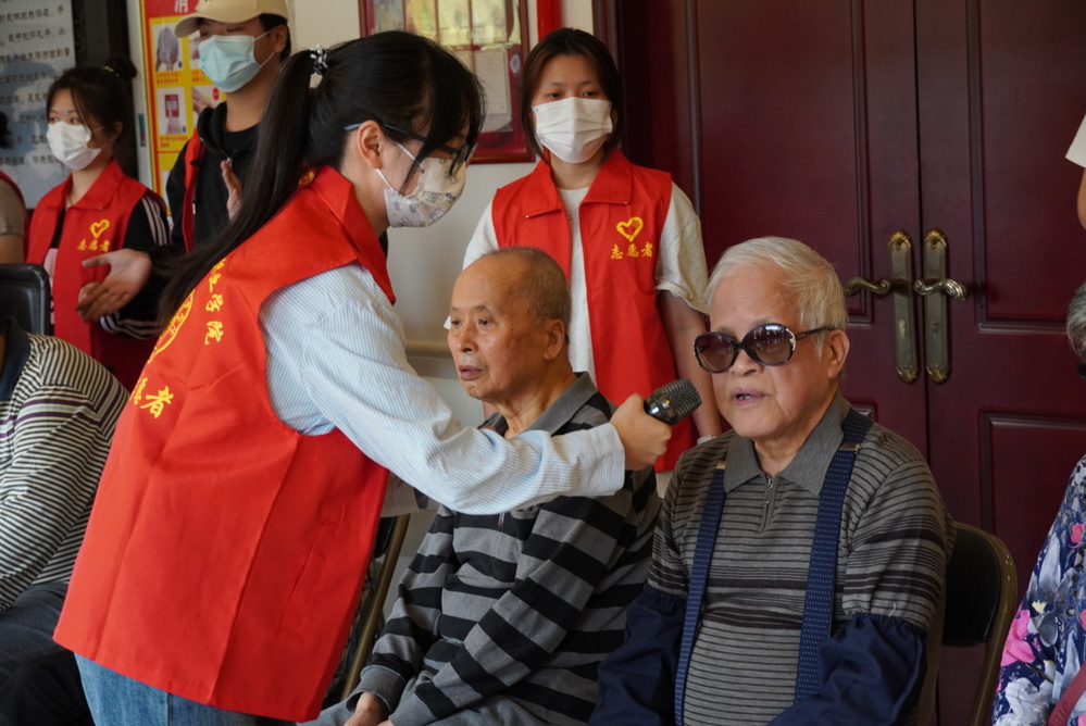 志愿者们一到达养老院,就送上了细心挑选的慰问品,向老人们表达了诚挚的节日祝福。随后,志愿者们为老人们献上了精心准备的文艺节目。合唱《粉红的回忆》拉开了表演的序幕,歌曲《我和我的祖国》和舞蹈《桃花多多开》进一步拉近了与老人们的距离,互动游戏《纸杯运球》、《数字打地鼠》让老人们的情绪高涨、喜笑颜开。一个个精彩的节目博得了老人们的阵阵掌声,养老院里充满了欢声笑语。
