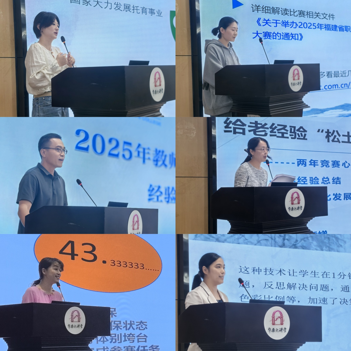 文化教育系于磊老师以“以赛促教 以赛促能”为主题,分享了早期教育专业在课程选择、资源整合与团队协作方面的实践经验;大数据应用系黄闽渝老师以“以营销思维破局,以学习力精进”为题,强调教学设计应具备用户思维与产品意识,推动教学成果可视化、可推广;大数据应用系余秀娣老师则以“给老经验‘松土’,让新思维‘抽芽’”为题,讲述了她连续两年参赛的心路历程与课程重构经验,强调专注领域、持续深耕的重要性;艺术设计系庄舒婕老师和文化教育系李苗老师,共同以“以赛促改 提升课堂新革命”为题,解析教学能力比赛政策,并分享了跨界参赛、AI技术融合、课堂实录等方面的实战心得;基础部田中玉老师分享了“从‘路人甲’到‘站台人’”的成长故事,生动诠释了团队力量、个人潜力、坚持精神,以及学生配合度在比赛中的重要性。