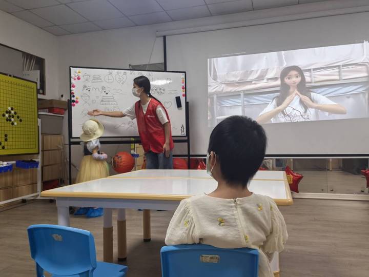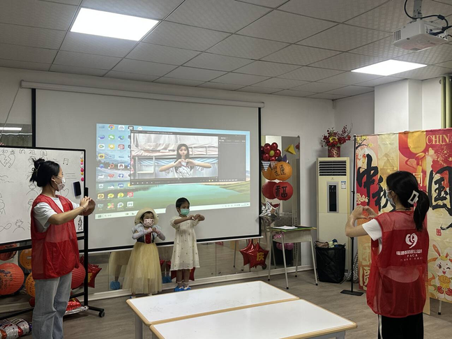 活动开始前,志愿者们提前30分钟到达场地,提前做好授课准备与卫生防护。课堂上,志愿者先以轻松的互动拉近与孩子们的距离,随后分步教学《我和我的祖国》手势舞:从基础手部动作拆解,到结合歌词节奏串联完整舞蹈,过程中还穿插了歌曲哼唱、借助图谱理解歌曲,让孩子们在愉悦的氛围中熟悉舞蹈。孩子们积极参与,从最初的略显羞涩,到逐渐跟随节奏配合动作,课堂中充满了欢快的笑声。活动尾声,志愿者与孩子们共同完整演绎手势舞,并摄影记录下这一温馨时刻。