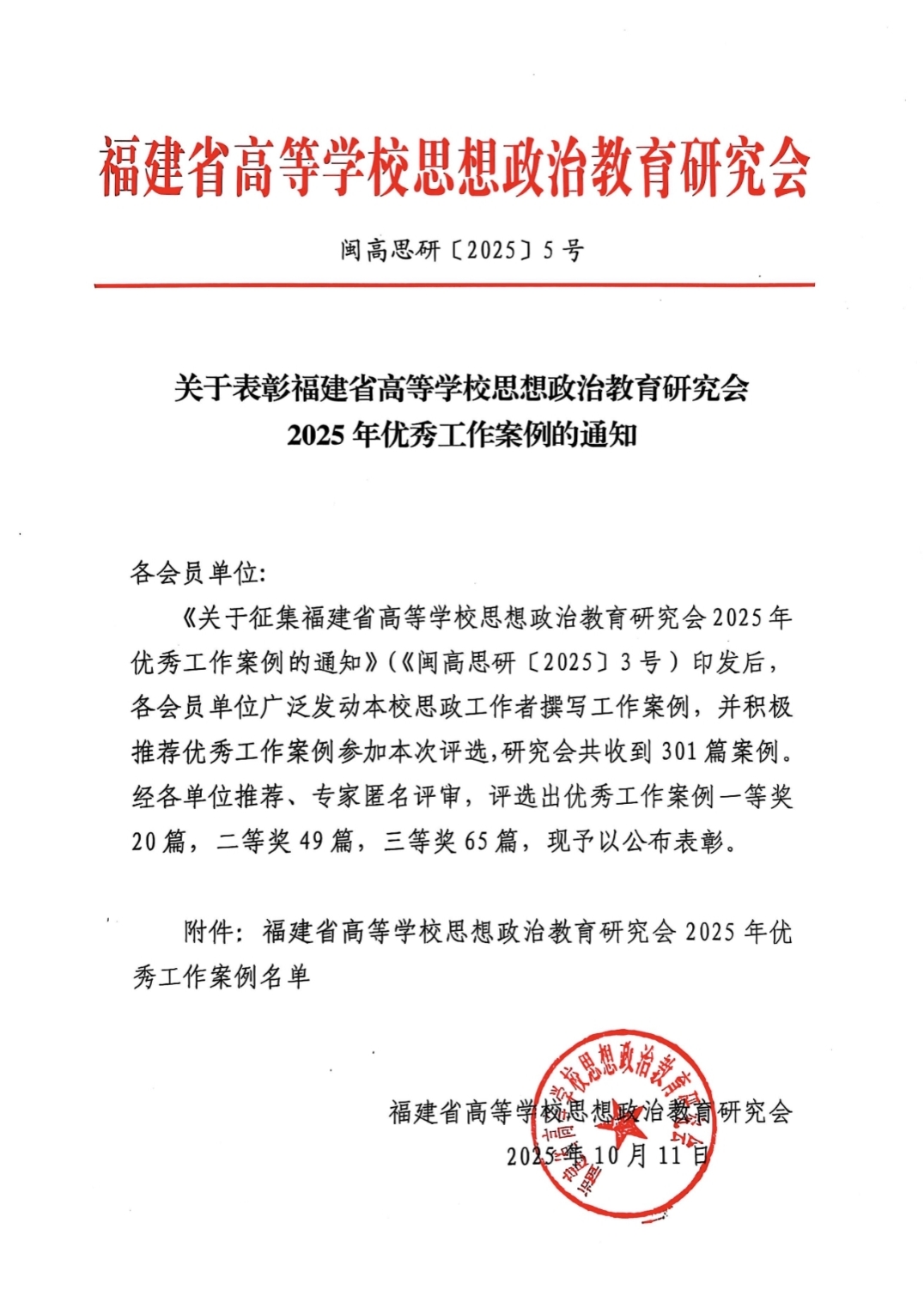 近日,福建省高等学校思想政治教育研究会公布《关于表彰福建省高等学校思想政治教育研究会2025年优秀工作案例的通知》。我校艺术设计系总辅导员黄雨晴的案例作品《在AI时代守护学术诚信:辅导员的一堂价值观引导课》荣获三等奖。