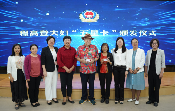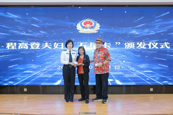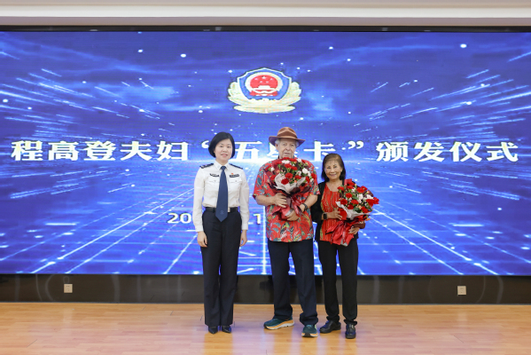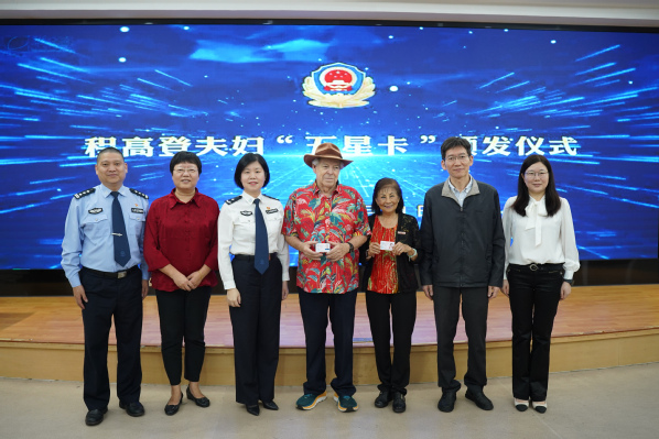仪式上,常务副局长潘臻颖为程高登夫妇颁发“五星卡”并献花。据悉,“五星卡”由国家移民管理局签发,是经批准在中国境内永久居留外国人的法定身份证件。持证人可在需要证明个人身份的场合作为个人身份凭证单独使用,无须再出示其外国护照,使用场景包括交通出行、生活消费、金融、通信等。程高登夫妇获得的“五星卡”是福州市首例由市政府层报省政府、公安部以突出贡献事由申请在华永居的案例。