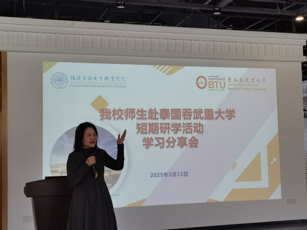 2025年3月12日,我校在女性研究中心举行了师生赴泰国吞武里大学研学活动学习分享会。学校副校长黄磊晶、研学团及各系约八十位师生参加了分享会,会议由外事处副处长程铭茜主持。