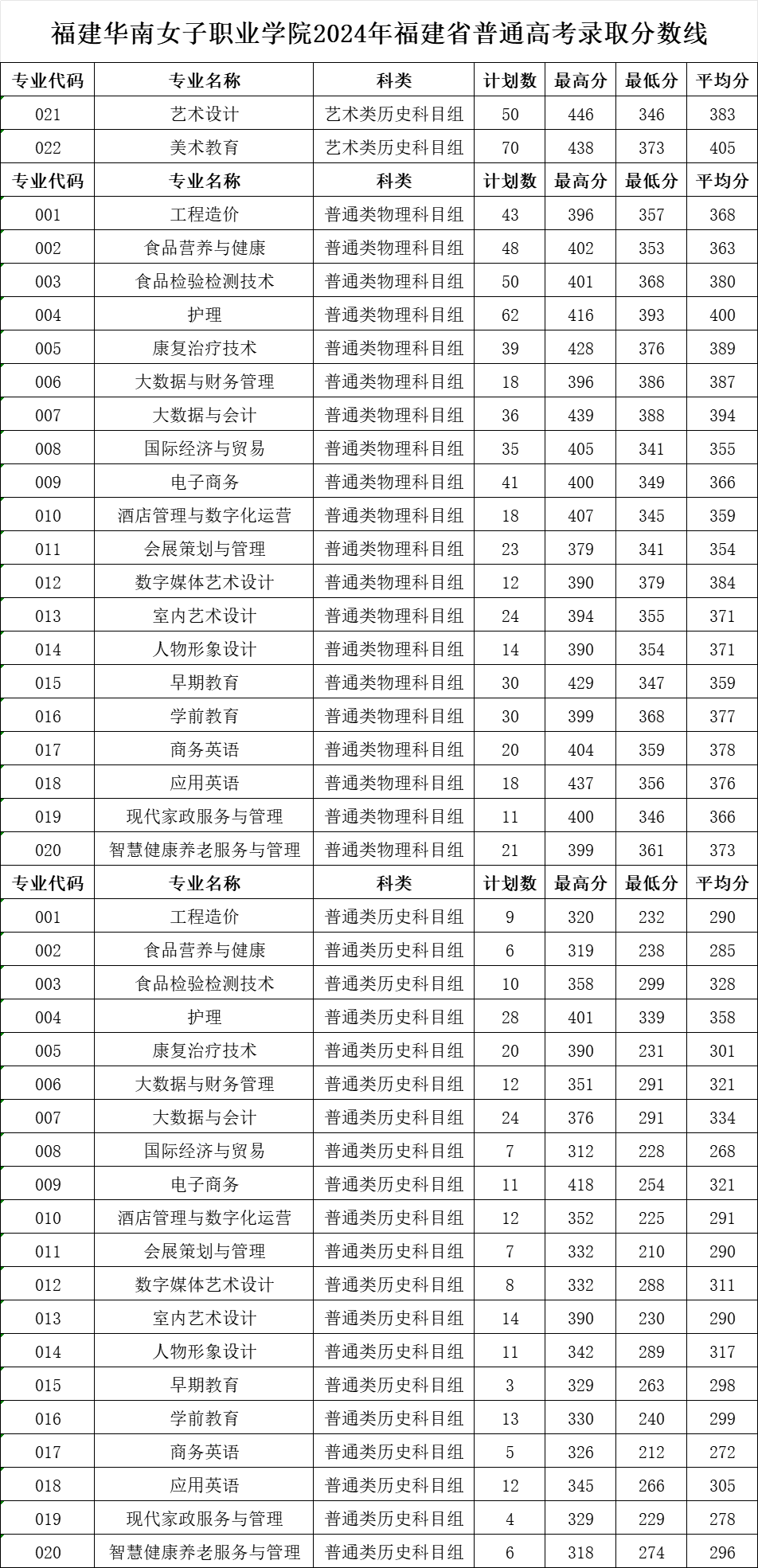 福建华南女子职业学院2024年福建省普通高考录取分数线