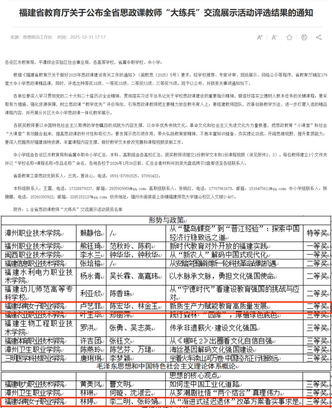 近日,福建省教育厅发布了《关于公布全省思政课教师“大练兵”交流展示活动评选结果的通知》(闽教思〔2025〕15号)。我校选送的卢艺菲、陈宏华、林金玉团队的《新质生产力赋能教育高质量发展》荣获“形势与政策”课程高职组三等奖;林婷、李二明、张铃娟团队的《从“渐进式延迟退休”改革方案看实事求是》荣获“毛泽东思想和中国特色社会主义理论体系概论”课程高职组三等奖。