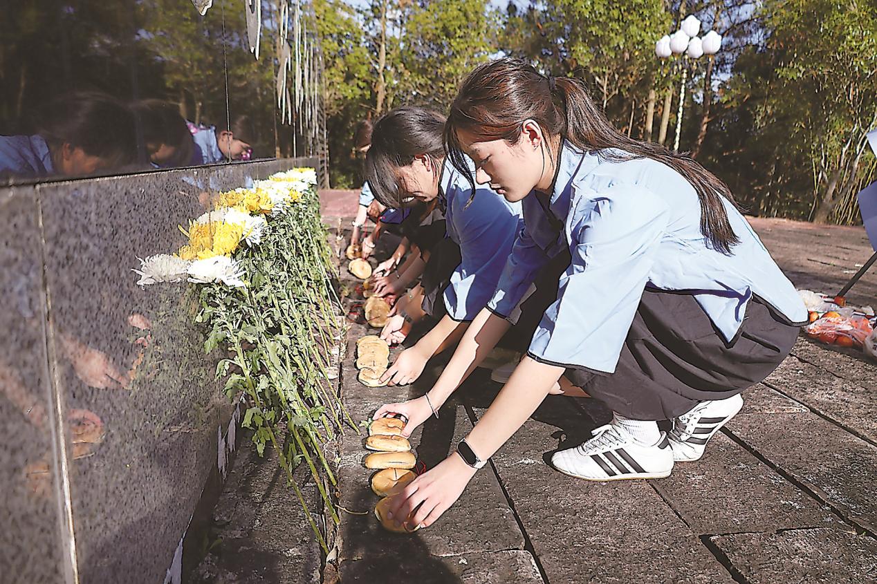纪念塔前,青年教师黄智博带领学生复刻当年的“支前光饼”制作场景。一张张写满缅怀之情与青春誓言的纸条,被细心塞入金黄的光饼中,随后被郑重敬献于纪念塔前。