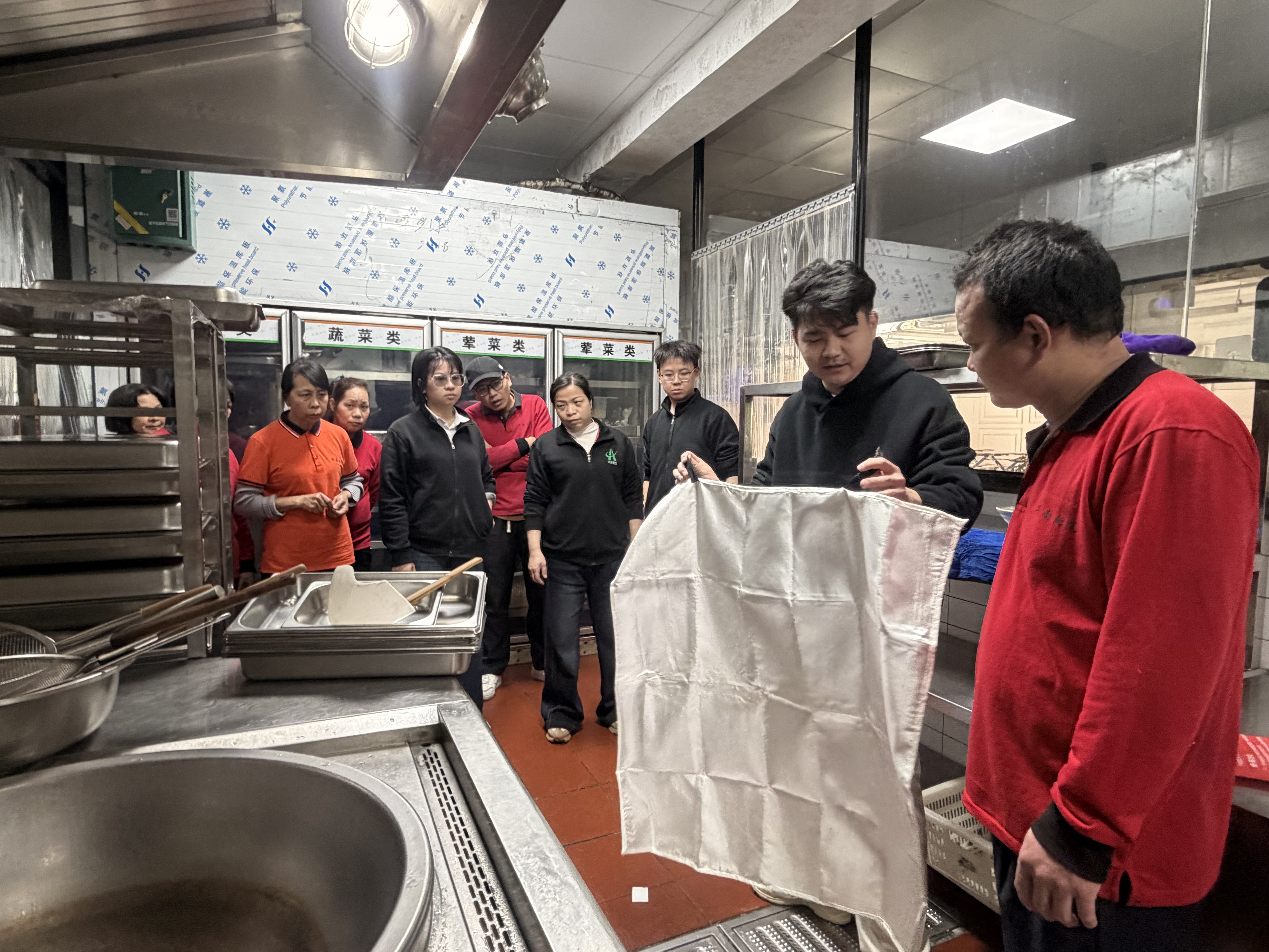 针对食堂工作岗位的特殊性,演练特别设置了灭火毯使用专项培训环节。保卫处演练负责人向后厨操作人员重点讲解了油锅起火的应急处置要点,并指导员工进行灭火毯实际操作演练,切实提升食堂员工应对厨房火灾的实战能力。