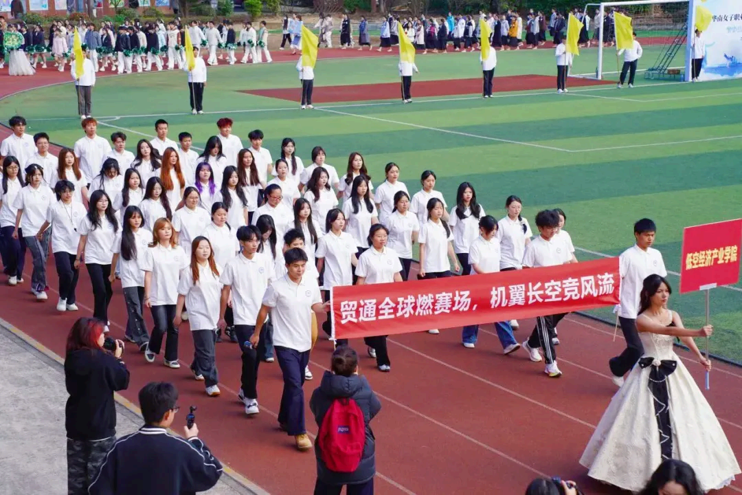 瞧!低空经济产业学院的方阵正迈着整齐有力的步伐昂首走来。“贸通全球燃赛场,机翼长空竞风流”,这醒目的横幅,是他们向赛场发出的激昂宣言。当镜头定格在这一瞬间,他们成为了运动会上耀眼的一束光芒,展现出蓬勃向上的精神风貌。