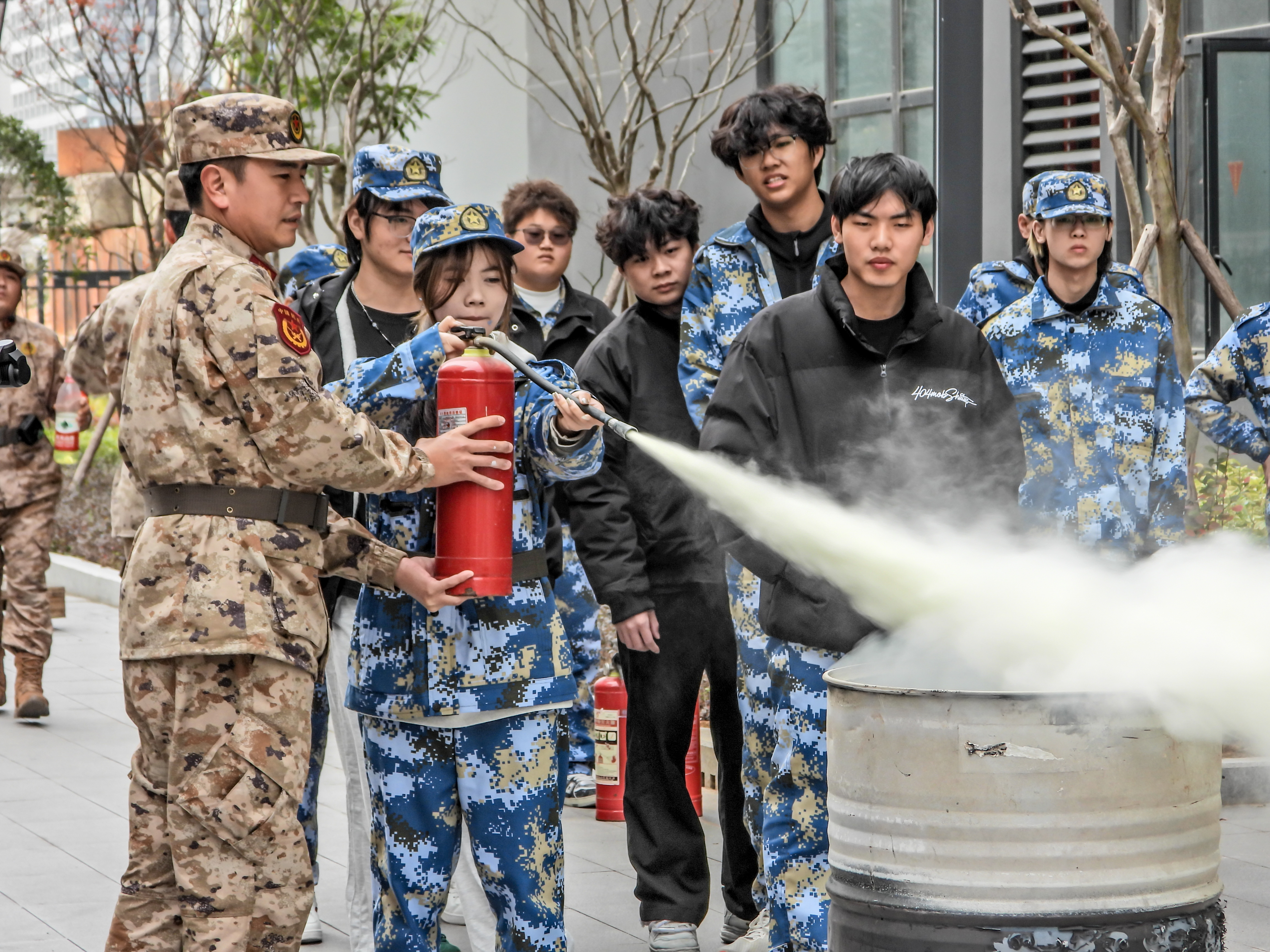 14时20分,灭火实操培训环节有序进行。教官系统且详细地讲解了灭火器的操作规范以及防毒面罩的使用要点,并结合实际案例进行深入的理论剖析。随后,组织学生代表进行现场实操演练。在教官的悉心指导下,学生代表认真操作,切实掌握了灭火器材的使用方法和防毒面罩的使用技巧。