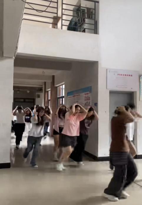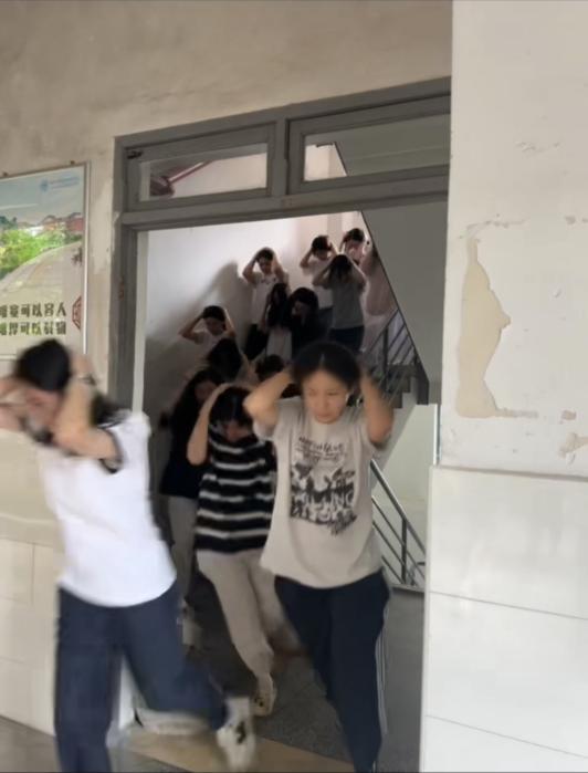 10月15日下午14:30,地震警报骤然响起,学生按指令护住头部,弯腰有序撤离。整个演练过程组织有序,撤离迅速,紧张而不慌乱。