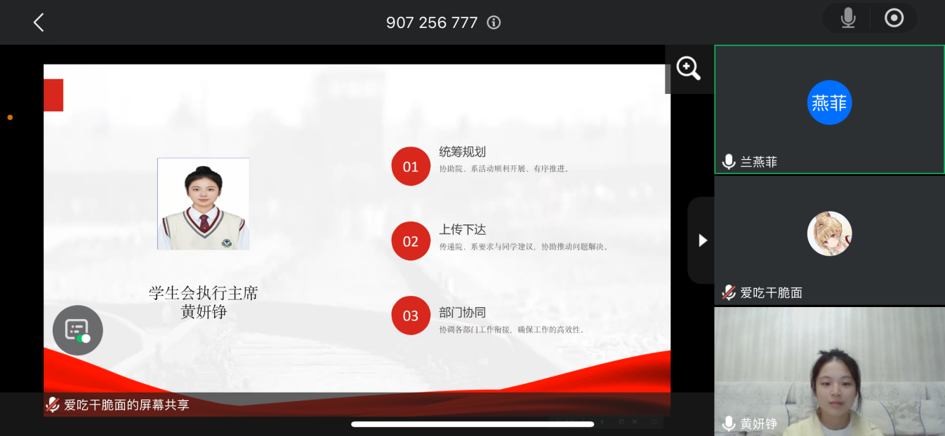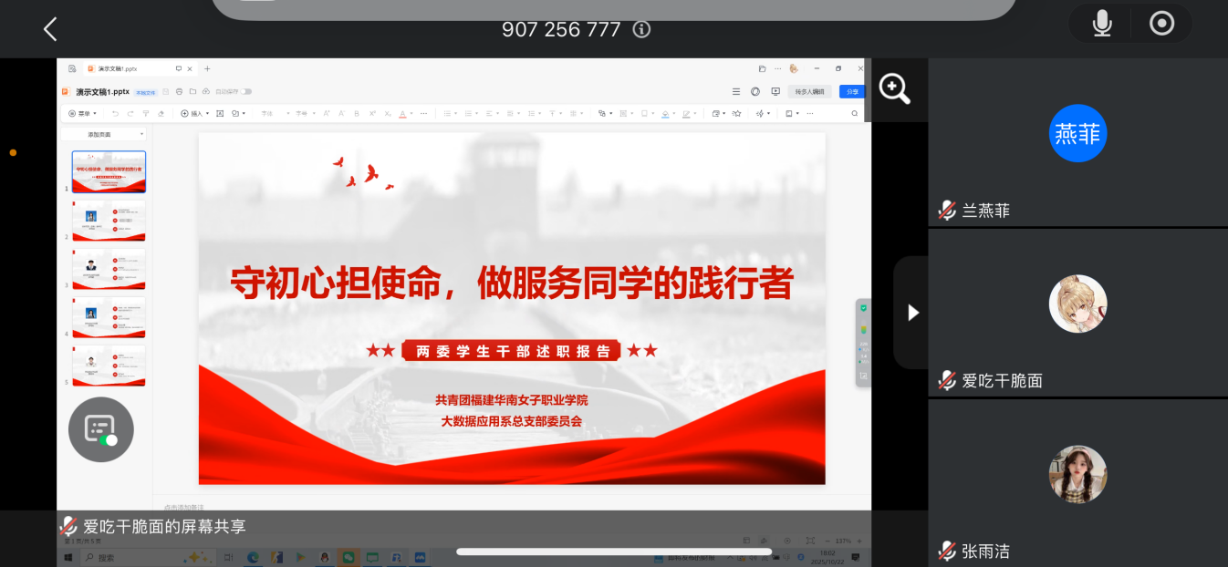 为进一步加强大数据应用系学生干部队伍建设,总结2024-2025学年学生工作以及各部门交接工作完成情况汇报,7月23日晚,大数据应用系团总支举行线上学生干部述职大会,团总支书记兰燕菲以及全体学生干部参加。