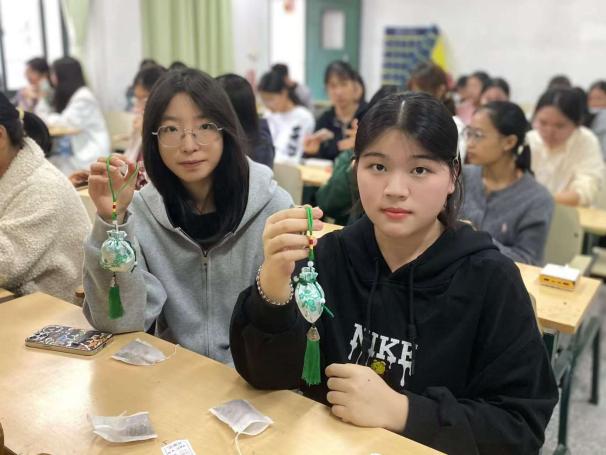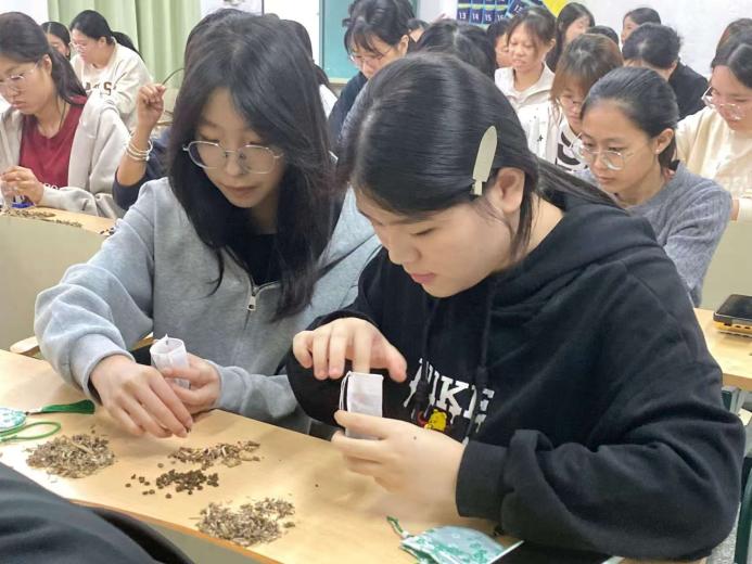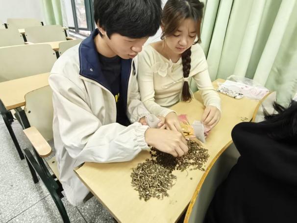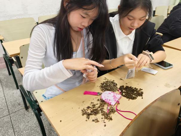 随后,学生干部一步步示范香囊制作流程,从分领广藿香、艾草、茱萸三种香料,到填充中药包、装入香囊、完成缝制,每一个步骤都细致讲解、耐心指导。大家围坐在一起,相互交流填充技巧,现场气氛热烈而温馨。经过一番努力,一个个散发着清香、样式精巧的香囊陆续完成,同学们捧着自己亲手制作的香囊和大家分享成果,每一个香囊都承载着满满的成就感和对美好祝愿的传递。