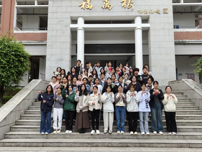 万福楼下的阶梯上,同学们捧着香囊错落而站,笑着凑成圈。有人举着香囊轻晃,有人眉眼弯成月牙,快门一响,便将阶梯上满是馨香的欢喜,定格成重阳里难忘的画面。