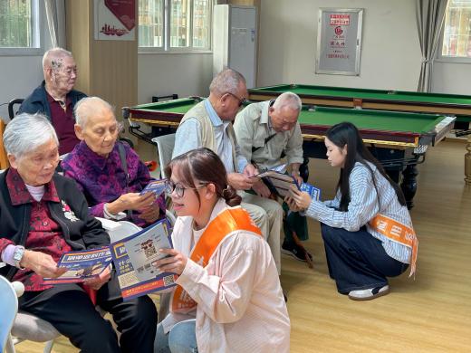 活动中,大数据应用系的同学们聚焦老年人财产安全问题,结合养老领域常见诈骗类型,通过发放手册、案例讲解、方言互动等形式,揭露“高息返利+赠送礼品”“虚构养老服务”等作案套路,用方言讲解与生活比喻化解专业壁垒,将将专业反诈知识转化为通俗易懂的生活语言,让长者在轻松氛围中筑牢金融安全防线。