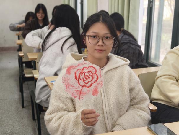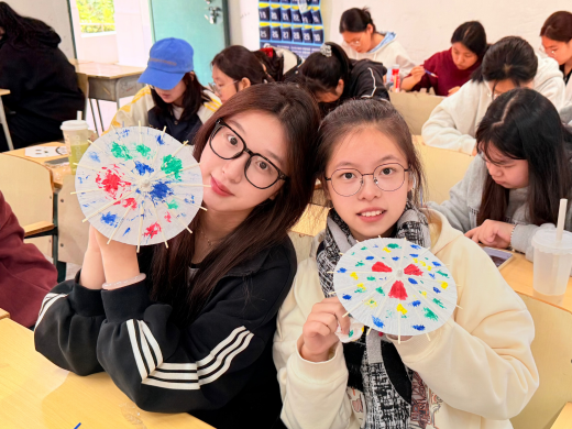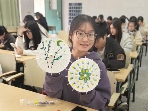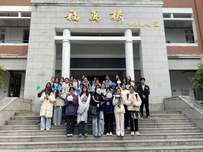 活动最后,同学们手持自己的作品,万福楼下的阶梯上,同学们托举油纸伞错落而站,一把把油纸伞在阳光下绽放出绚丽的色彩,既有传统的雅致,又有青春的活力。看着自己亲手制作的油纸伞,感觉特别有成就感。这不仅是一次手工体验,更是一次文化之旅。