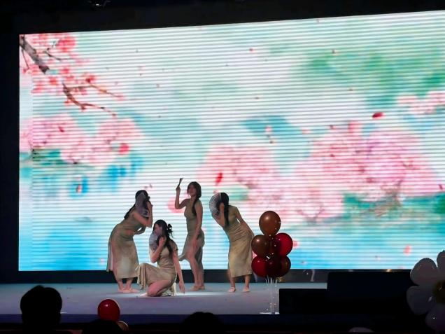 随后,歌舞、小品、串烧等多元节目轮番登场,精彩纷呈:对唱《我的歌声里》温柔诉说同窗情谊,舞蹈《What is Love》《SM 大战 YG》尽显青春锋芒,歌曲《有点甜》传递校园美好,《舞蹈串烧》解锁创意活力;韩舞《Gee》元气满满,小品《甄嬛传之外卖风波》爆笑连连,古风舞蹈《芒种》雅致灵动,为现场观众呈现了一场视听盛宴。