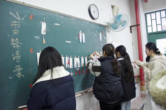 提笔落墨,同学们不仅在书写文字,更是在践行承诺、感悟初心。笔墨交织间,雷锋精神不再是遥远的口号,化作了可触可感的青春行动。创作完成后,所有书签用木夹固定在麻绳上,分层悬挂成独具特色的展示板,搭配温馨主题装饰,让雷锋精神可观可赏,营造出浓厚的校园文化氛围。