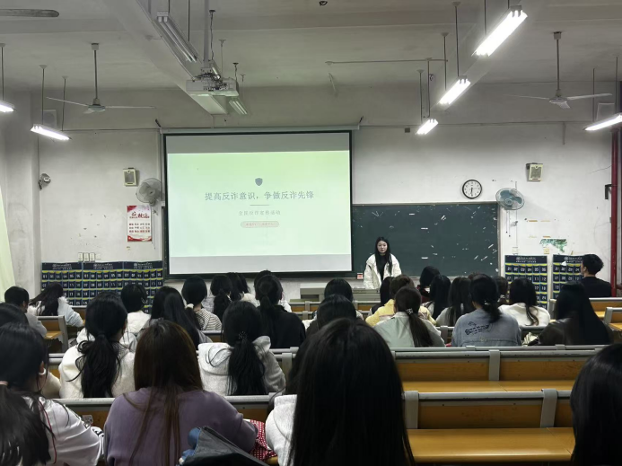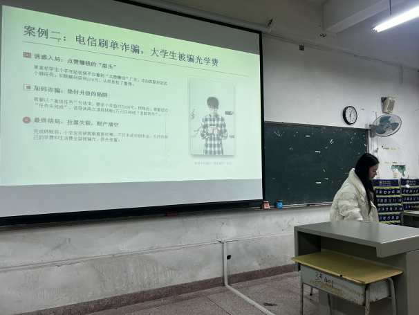 活动中,借助PPT开展系统反诈知识宣讲。先是明确诈骗的核心定义,让同学们精准把握诈骗行为本质;随后逐一讲解校园及社会高发的常见诈骗形式,剖析各类诈骗的作案手法与典型特征;接着重点传授实用有效的防骗技巧,指导同学们从源头规避诈骗风险;最后结合多起真实诈骗案例进行深度解读,用鲜活事例警醒大家提高警惕,远离诈骗陷阱。