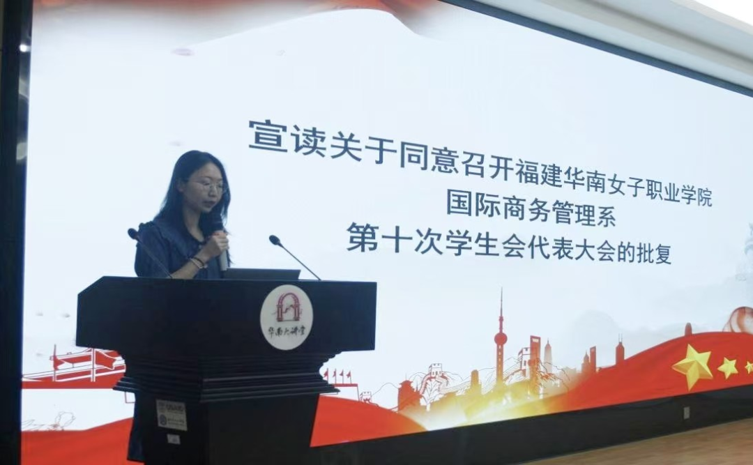 大会严格遵循既定议程,在庄严的《义勇军进行曲》中正式开幕。全体与会人员肃立致敬,齐唱国歌,现场氛围庄重肃穆。随后,团总支书记方佳慧老师代表系部郑重宣读《关于同意福建华南女子职业学院国际商务管理系第十次学生代表大会的批复》,明确了大会的合法性与重要意义,为大会的有序推进奠定了坚实基础。
