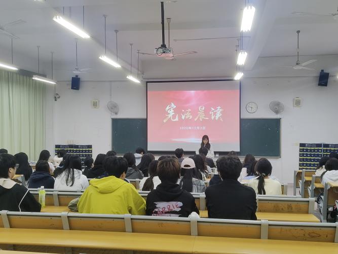 为深入贯彻落实“学宪法 讲宪法”活动要求,厚植青年学子宪法意识,筑牢法治信仰根基,国际商务管理系于2025年12月2日下午17:40-18:40在教4-102教室成功举办国家宪法日“宪法晨读”活动。青马班干部、入团积极分子及学生会干部代表齐聚一堂,以庄重仪式感悟宪法精神,以实际行动践行法治理念。