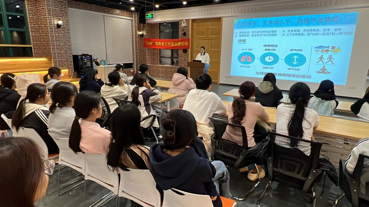 本次活动是国际商务管理系与“心桥”辅导员工作室协同推进学生心理支持工作的实践举措。活动现场,袁医生以“理论讲解 +实操指导”相结合的形式,围绕情绪管理核心模块展开指导:在心理疏导层面,依托PPT呈现“认知重构-情绪宣泄-正念冥想”的分层疏导路径,指导学生通过思维调整转换负面认知、以健康方式释放情绪,并现场带领完成1分钟正念冥想练习;在生理调节层面,结合学生日常状态,分享“20 分钟高效补觉”“情绪稳定类食物摄入”“4-7-8 呼吸法”“简易舒展运动”等实用技巧,引导学生同步体验实操。
