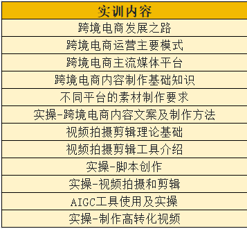 在理论认知环节,系统讲解跨境电商发展现状、运营主要模式及主流媒体平台特性,帮助学生搭建行业知识框架;内容创作模块中,深入拆解跨境电商内容制作基础知识、不同平台素材制作要求,同步开展内容文案撰写及制作方式实操训练,提升学生内容产出能力;视频营销板块围绕“理论-工具-实操”展开,从视频拍摄剪辑理论基础、工具功能介绍,到脚本创作、实地拍摄与后期剪辑全流程实操,让学生掌握可视化内容制作核心技能;此外,实训还新增AIGC工具使用及实操课程,指导学生运用智能工具制作高转化视频,同时融入跨境热销品类数据分析方法与实操训练,培养学生数据驱动的运营思维。