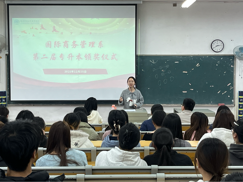 为表彰先进、树立榜样,进一步激发学生专升本备考热情,12月10日,国际商务管理系第二届专升本模拟考颁奖仪式在教学楼3-102顺利举行。系部老师、专升本指导教师及全体获奖学生共同参与本次活动。