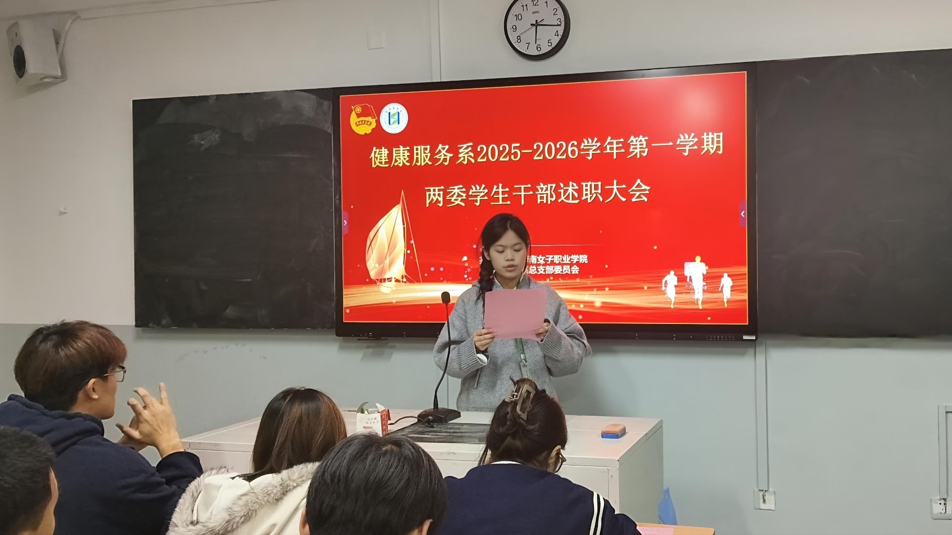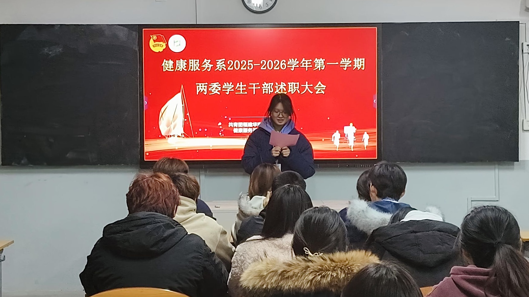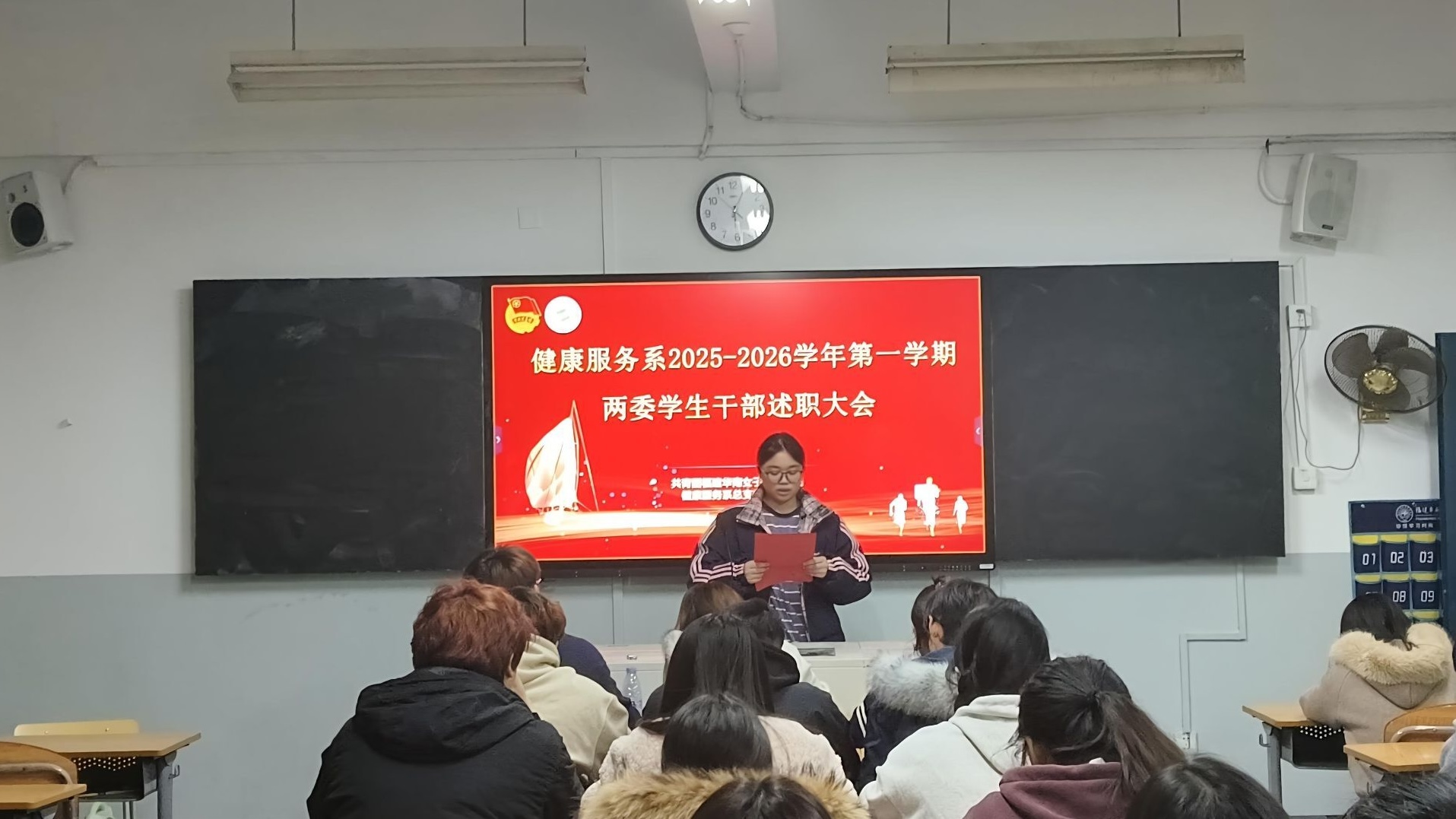 为全面总结系部本学期学生工作成效,夯实团学组织建设根基,提升学生干部服务效能,近日,健康服务系召开2025-2026学年第一学期学生干部述职大会。系团总支书记黄加慧老师、学生委员会主席团成员、各部门负责人参加会议。
