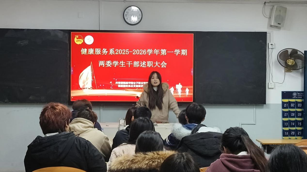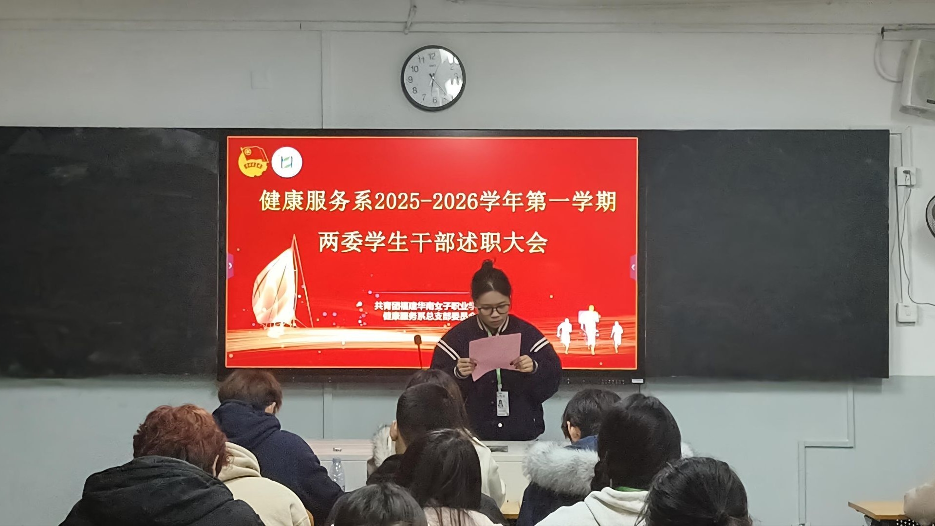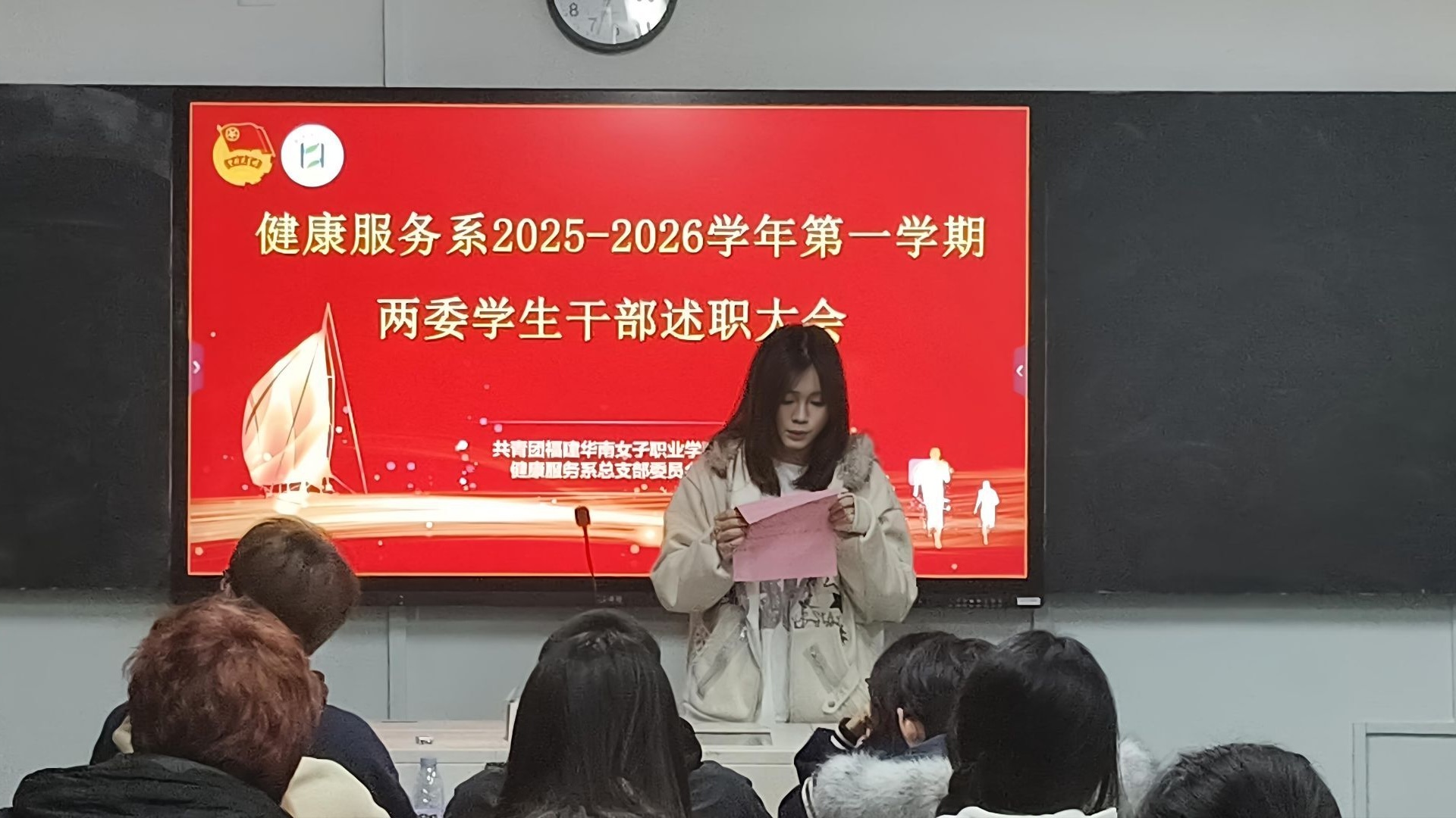 为全面总结系部本学期学生工作成效,夯实团学组织建设根基,提升学生干部服务效能,近日,健康服务系召开2025-2026学年第一学期学生干部述职大会。系团总支书记黄加慧老师、学生委员会主席团成员、各部门负责人参加会议。