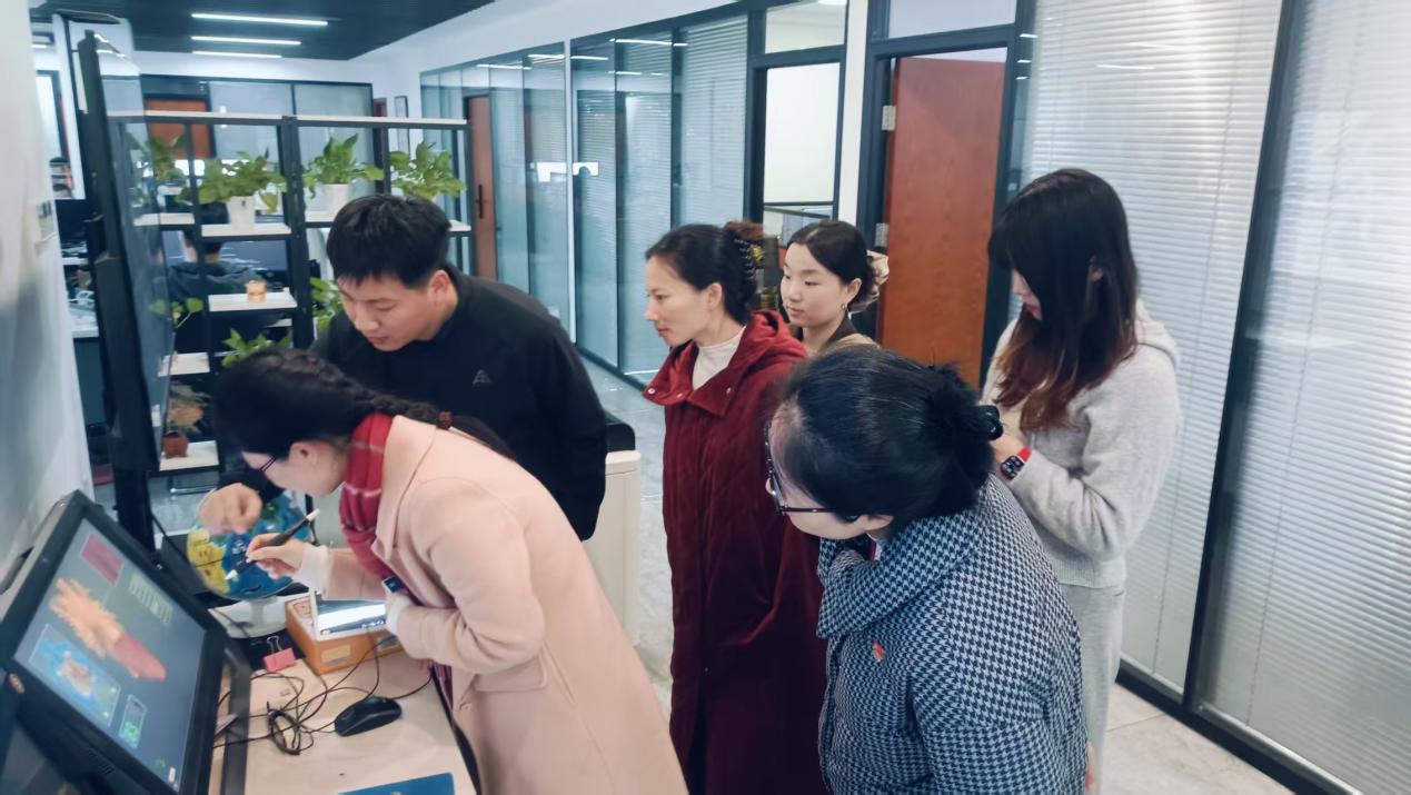 教师团队实地参观了犀牛科技的技术展示区与实训体验区。企业详细介绍了在产教融合领域的实践成果,重点演示了虚拟仿真技术在医疗、护理、工程等领域的创新应用。其中,近距离观摩体验了全息透明柜、MR桌面互动一体机、AR互动台、裸眼3D屏等设备,深入了解VR/AR技术在护理实操模拟、急救场景演练等方面的实操价值,直观感受了数字化技术为护理教学带来的革新与突破。