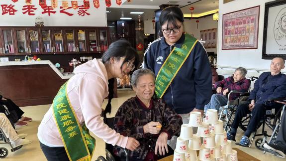 活动现场,师生志愿者们将专业所学融入活动内容:开场的手势舞节奏舒缓,传递温馨与祝福。特别设计的“幸运传福球”“纸杯数字消消乐”与“乒乓球夹夹乐”三个互动游戏,兼具趣味性与适老性,在欢声笑语中帮助长者活动肢体、协调身心。当《歌唱祖国》的旋律响起,唤起了许多爷爷奶奶的美好记忆,在动情的合唱中得到了情感抚慰。志愿者们全程耐心讲解和示范、贴心陪护和照料,活动后还细心协助长者离场,主动整理场地,展现了我校师生良好的精神风貌和职业素养。