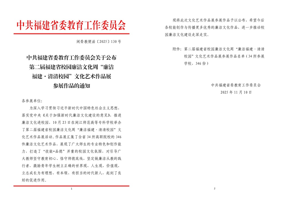 近日,省委教育工作委员会正式公布第二届省校园廉洁文化周“廉洁福建・清清校园”文化艺术作品展参展名单,我校选送的12幅作品凭借深刻的廉洁主题、优秀的艺术表现力成功入选,充分展现了我校校园廉洁文化建设的丰硕成果。