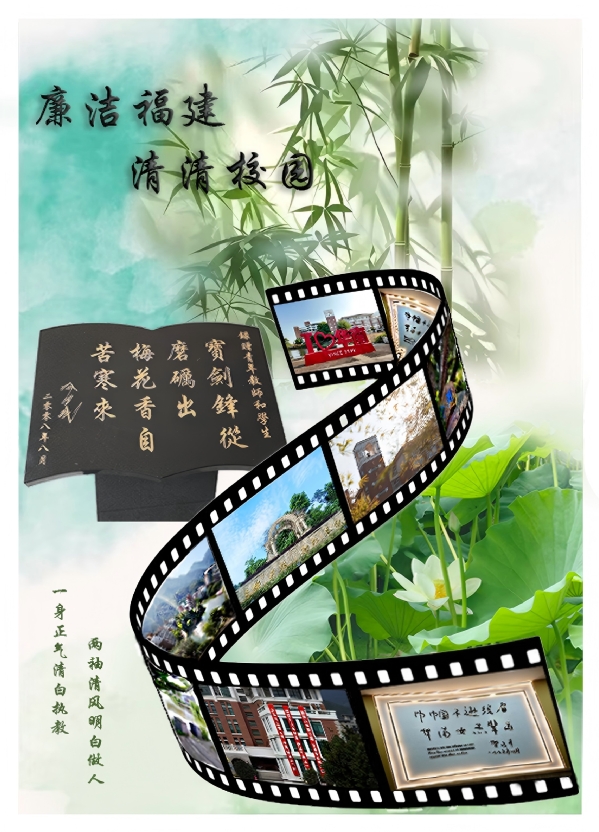 作品简介:本作品以传统水墨风格为基调,融合现代胶片创作形式,将象征廉洁清明的青竹、荷花意象,与学校校园景观相融,营造出浸润人心的廉洁文化氛围。作品以胶片镜头定格校园风貌,辅以廉洁主题标语,将抽象的廉洁文化具象化,生动展现学校在廉洁文化培育、校园育人环境打造方面取得的丰硕成果。