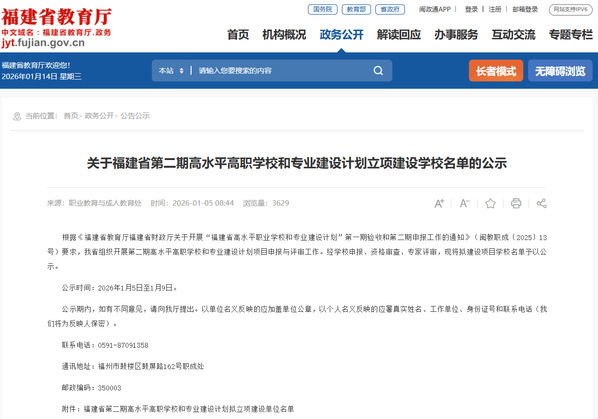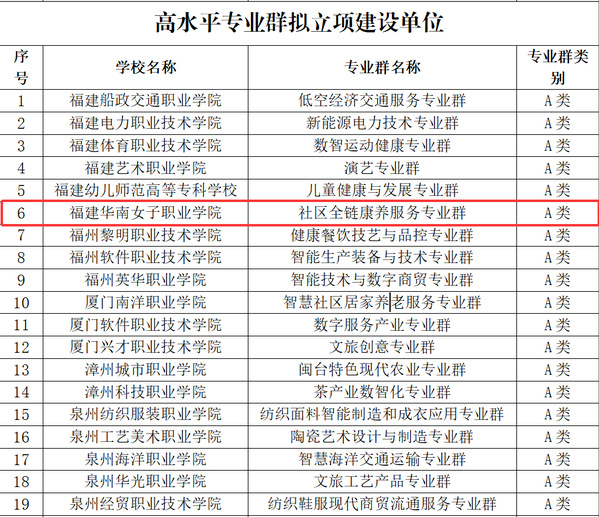 近日,福建省教育厅公示了福建省第二期高水平高职学校和专业建设计划拟立项建设单位名单,根据《关于福建省第二期高水平高职学校和专业建设计划立项建设学校名单的公示》文件,我校“社区全链康养服务专业群”入选省级高水平专业群(A类)。