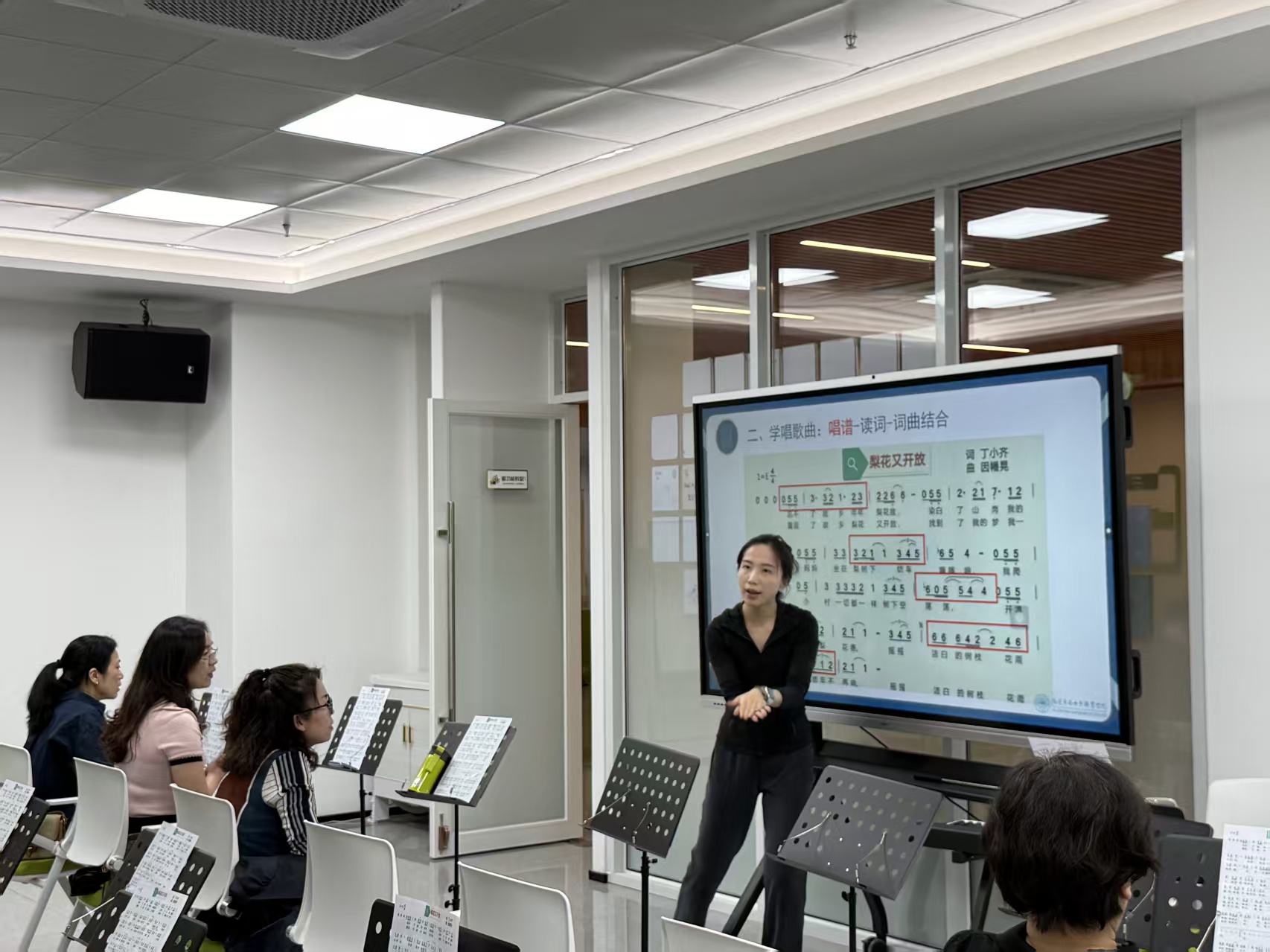 体验课上,郭陈旖老师围绕《梨花又开放》的旋律特质与情感内核,打造了极具针对性的教学流程。她先以 “音乐故事分享” 为切入点,结合自身对歌曲的理解,讲述《梨花又开放》中蕴含的乡愁与岁月温情,让经历过相似年代的老年学员们迅速产生情感共鸣。在情感铺垫之后,郭老师才进入专业教学环节,帮助学员们逐一突破演唱难点。