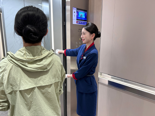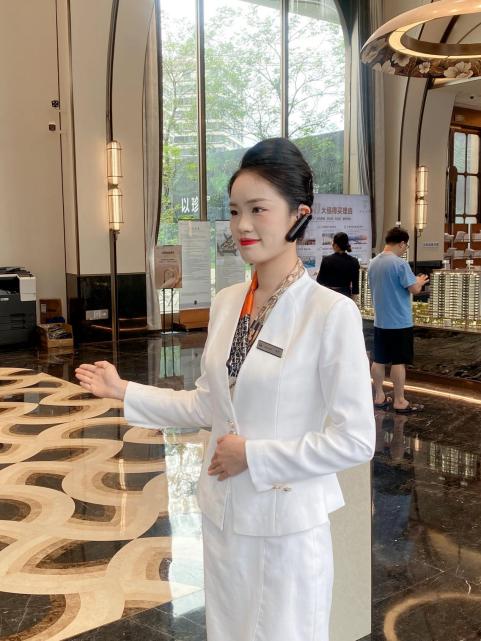在福州左海集团金山文萃公馆案场,席亚楠同学以专业案场客服形象成为亮点。她能精准判客登记,还能周到完成水吧台的接待,保障案场服务品质与客户体验。她在工作中严格遵循礼仪规范,站姿保持标准姿态,将空中乘务专业化标准完美融入到地产服务。