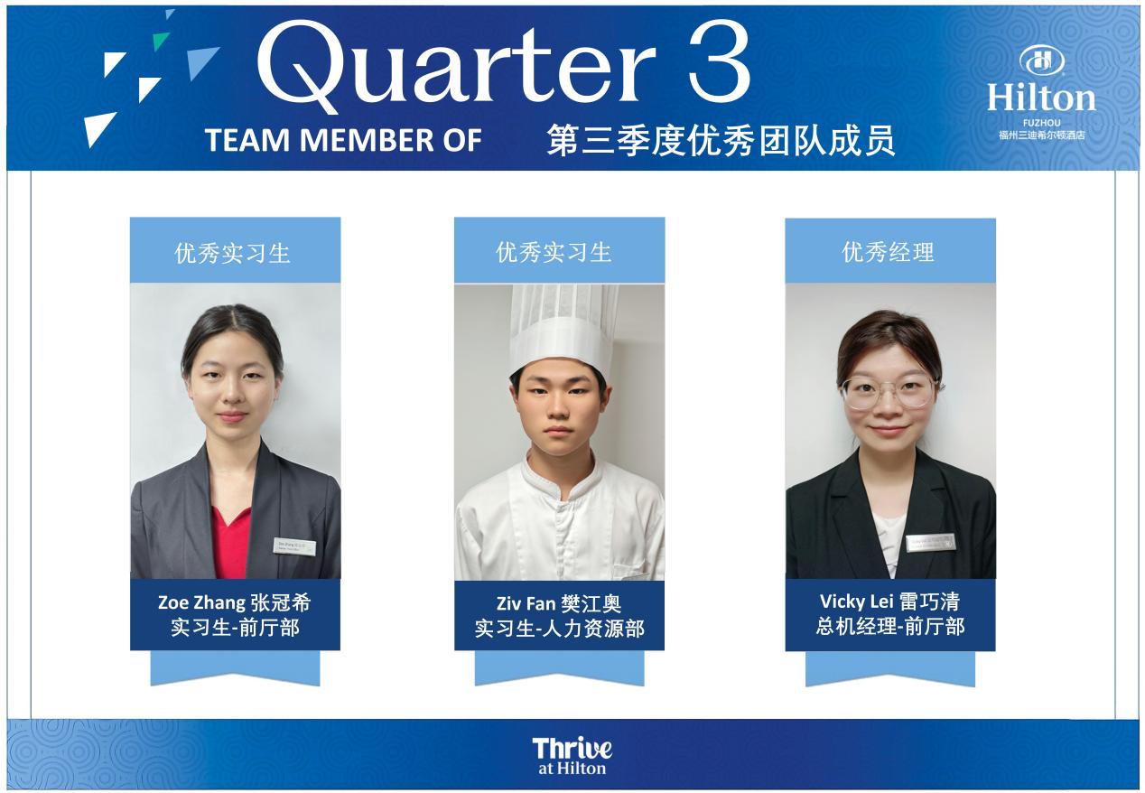 凭借出色的服务意识、扎实的业务能力和高度的团队协作精神,张冠希同学荣获“希尔顿酒店第三季度优秀实习生”称号。