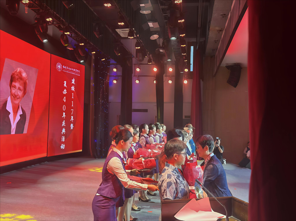庆典颁奖环节,当获奖教师登台时,空乘礼仪志愿者在侧小心搀扶,用她们周到的服务传递对师者的敬重;颁奖环节中,礼仪志愿者们双手稳稳托举荣誉证书与奖牌,精准递至颁奖嘉宾与获奖教师手中,姿态端庄优雅;仪式结束后,她们又细心引导教师走下舞台,全程无微不至。