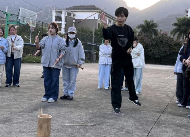 紧接着的“投壶挑战”考验精准度与耐心,大家凝神聚力瞄准壶口投放箭矢,成功投中者与队友击掌欢呼,未投中者也不气馁,认真观察队友技巧及时调整方法。