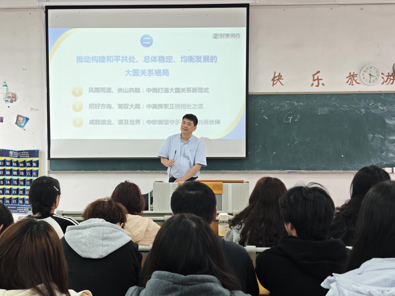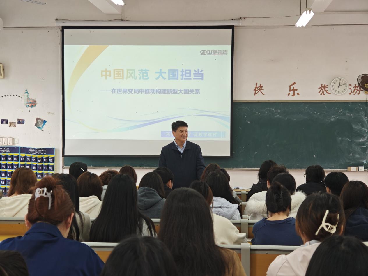 2026年4月7日下午,我校党委书记张林走进课堂,以《中国风范大国担当——在世界变局中推动构建新型大国关系》为题,为旅游服务系2024级会展策划与管理1、2班学生讲授“形势与政策”课,引导青年学生准确把握国际形势发展大势,坚定理想信念,厚植家国情怀。