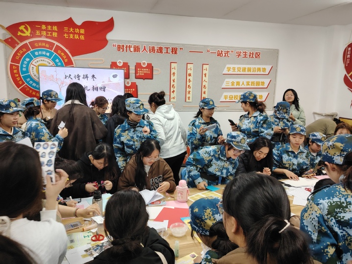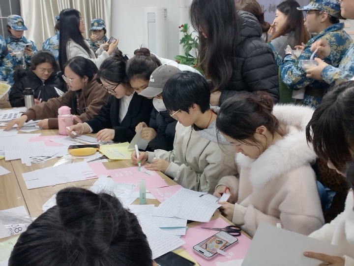活动现场暖意融融,长桌上摆满了丰富的创作材料:印着诗词短句的卡片、五颜六色的彩笔、生动可爱的贴纸以及颇具质感的背景纸,为同学们提供了自由抒发的艺术空间。大家带着满满的热情和巧思投入创作,有的认真翻找心仪的词句,有的低头专注地裁剪拼贴,有的手写专属文字增添温度,还有的用简单几笔简笔画做装饰。原本零散的文字碎片,在大家手中慢慢变成了有新意、有温度的诗行——既呼应着冬至的节气氛围,也承载着对学业生活的感悟、对时代风貌的感知,传统韵味和青春气息在纸上自然融合,每一幅作品都藏着独属于创作者的冬日心意。