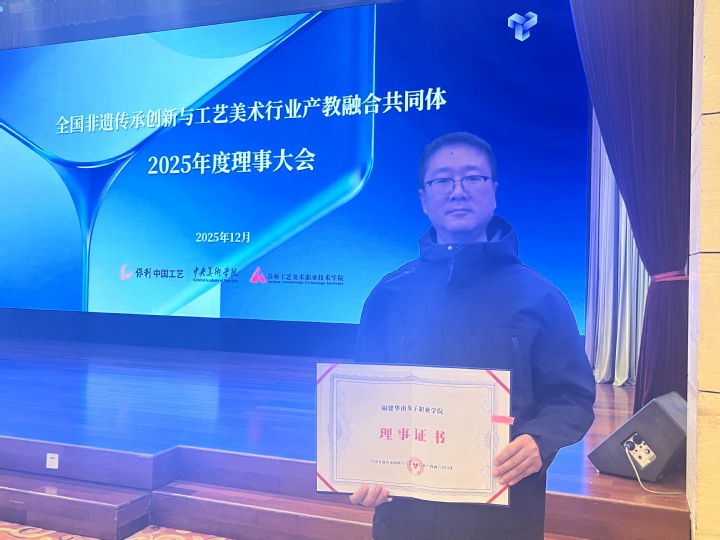 2025年12月8日至9日,我校美术教育专业主任李海滨应邀赴北京参加全国非遗传承创新与工艺美术行业产教融合共同体2025年度理事大会,并代表学校接受理事单位授牌。