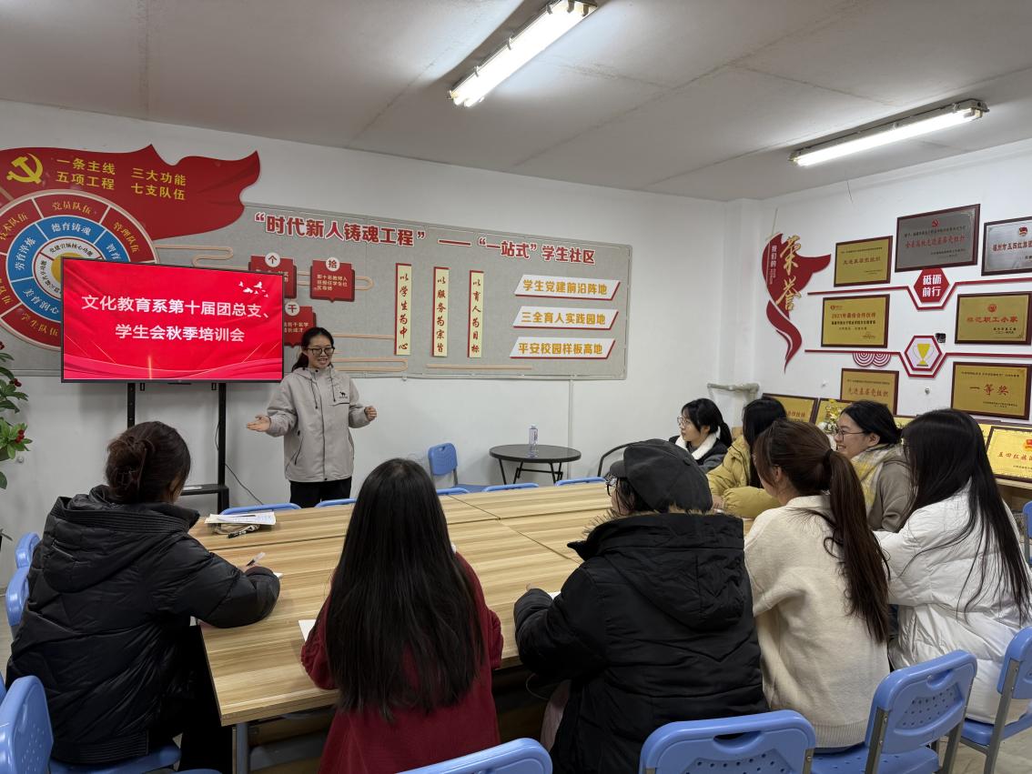为提升新一届学生干部的综合素质与履职能力,加强组织建设,近日,文化教育系在“一站式”学生社区服务中心组织召开第十届团总支、学生会秋季培训会。