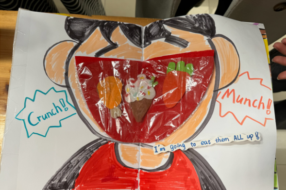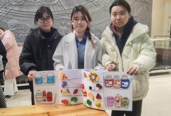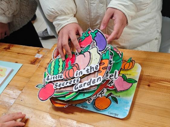 最引人注目的是一组聚焦“饮食文化”的机关书:左侧页面用毛毡制作牛奶、果汁等饮品模型,右侧通过抽拉设计展示食物消化过程,配合“Crunch!Munch!”等拟声词,将英语学习变成沉浸式游戏。这种“做中学”的理念,正是产教融合最生动的注脚。