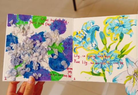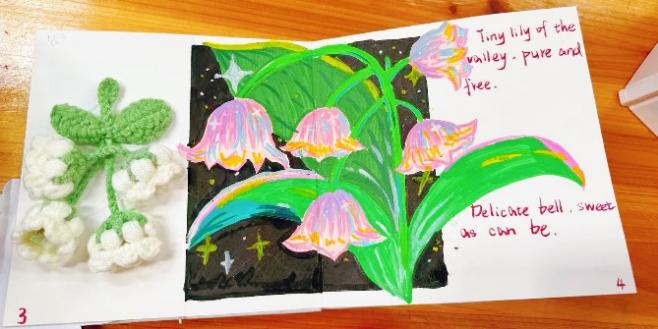 跨媒介绘本:第三组学生将毛线钩织的铃兰花与手绘星空结合,英文诗句“Tinylilyofthevalley,pureandfree”在实物与绘画的碰撞中更显生动。