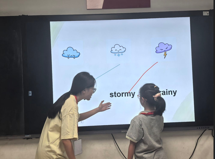 课堂上,志愿者们将抽象的语言转化为可触可感的趣味体验。有的志愿者用诗歌绘本带孩子朗读英文诗句,感受文学与语言的双重美;有的借助卡通绘本、天气图标等设计互动问答,或者用游戏引导孩子认物体、学表达;还有的志愿者模拟生活场景,让孩子在角色扮演中自然输出英语。志愿者们用贴近儿童生活的素材,让英语学习从“被动接受”变为“主动探索”,教室里的举手抢答、专注眼神,正是兴趣被点燃的最好注脚。