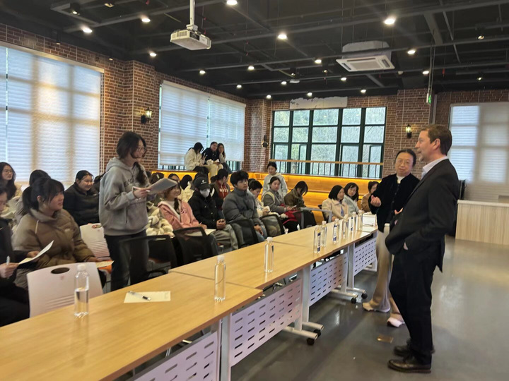 史道晨教授对中国文化抱有高度认可与浓厚兴趣,讲座中,他结合多年教学研究与实践,系统阐释了中国文化元素在美国文理课程体系中的融入方式、呈现形态及其时代价值,并分析了中美教育理念之间的互鉴逻辑与合作可能。其分享既有学术理论支撑,又有实践案例佐证,为在场师生拓展了国际教育视野,引发深入思考。互动环节,师生们围绕跨文化沟通与中国文化传播等话题踊跃提问,现场气氛热烈而有序,充分展现了思想的碰撞与交流的活力。