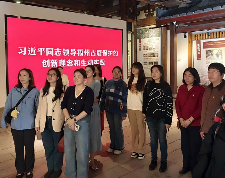 在讲解员的带领下,党员老师们依次参观了各个展区,深入了解三坊七巷从“危在旦夕”到“活态传承”的蝶变历程。从古建筑修缮的匠心工艺,到历史街区的活化利用;从文化遗产的保护传承,到民生福祉的同步提升,一幅幅生动的画面、一个个鲜活的案例,让老师们直观感受到福州在古厝保护中践行的“保护为主、抢救第一、合理利用、加强管理”方针,深刻体会到“以人民为中心”的发展思想在文化保护工作中的生动实践。