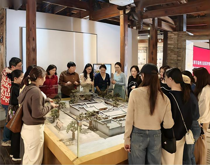 在古厝微缩模型前,老师们驻足研讨,详细了解传统民居的建筑特色与保护修缮技术,结合学前教育专业特色,探讨如何将福州本土文化、古厝文化融入学前教育教学与实践,让传统文化在下一代心中生根发芽。
