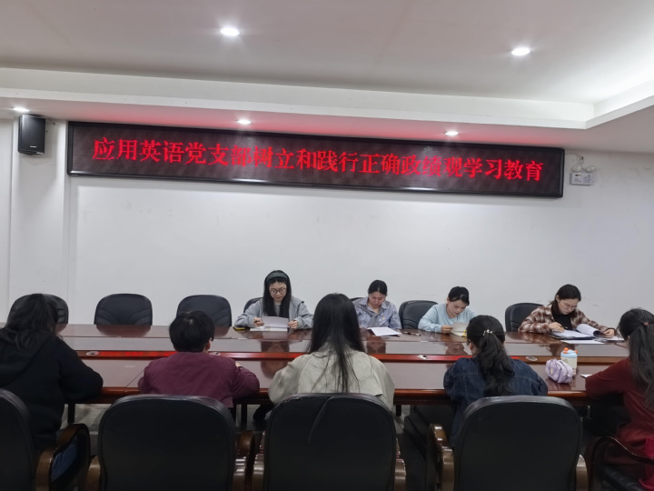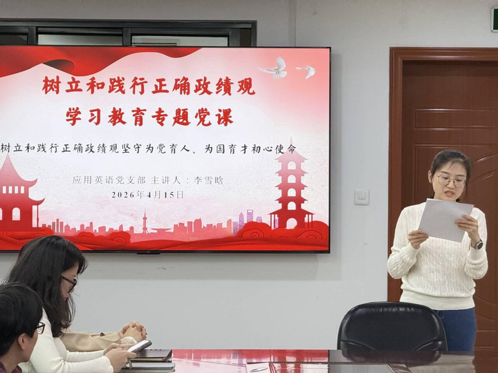 为深入推进全党树立和践行正确政绩观学习教育,引导支部党员教师筑牢思想根基、坚守育人使命,2026 年 4 月 15 日上午,应用英语党支部在综合楼 106 会议室召开专题支部会议,全体党员教师齐聚一堂,以集中学习、研讨交流、专题党课三位一体的形式,扎实开展学习教育活动。